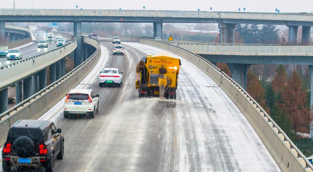 1月19日,在河南省洛阳市古王立交,市政集团车辆对路途进行撒布融雪剂作业(无人机相片)。