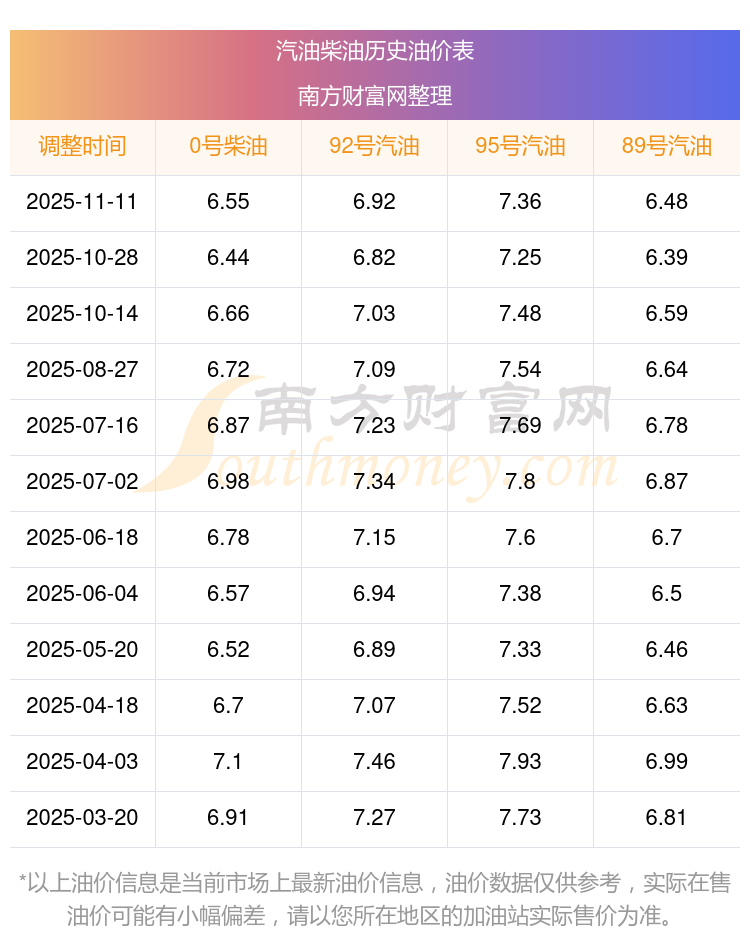 南边财富网声明:资讯仅代表作者自己观念。不确保该信息(包含但不限于文字、数据及图表)悉数或许部分内容的准确性、真实性、完整性、有效性、及时性、原创性等,若有侵权,请第一时刻奉告删去。仅供出资者参阅,并不构成出资主张。出资者据此操作,危险自担。【油价查询】西宁95号-92号汽油价格今天多少钱一升?11月13日95号汽油价格今天价格表油价调整一手音讯: 西宁汽油、柴油11月13日价格多少钱一升?详细为:0号柴油为6.51元,上调了0.1元;95号汽油为7.39元;92号汽油为6.9元;89号汽油为6.47元,调整时刻为11月11日。 西宁 下一轮油价调整时刻11月24日24时,间隔现在还有11.69天。 西宁2025年11月24日24时油价调整一手音讯2025时刻表,92号油和95号到底有哪些差异?本次油价调整的时刻为11月11日 ,调整后全国油价详细为: 92号汽油平均价格:7元每升,其间,最高为海南,价格8.06元/升,最低为陕西,价格6.83元/升。 95号汽油平均价格:7元每升,其间,最高为海南,价格8.55元/升,最低为陕西,价格7.22元/升。 0号柴油平今天油价查询:今天11月13日,浙江诸暨加油站调整后92、95汽油最新零售价11月13日浙江诸暨汽油、柴油每升的价格是11月11日调整后的价格:92号汽油为6.92元,增了0.1元,增幅达1.47%;95号汽油为7.36元,增了0.11元,增幅达1.52%;89号汽油为6.41元,增了0.09元,增幅达1.42%;0号柴油为6.57元,增了0.11元,增幅达1.7%。 下一轮油11月13日全国油价-89号汽油价格-国内今天油价调整一手音讯,油价多久调整一次依据11月11日油价调整后的价格,全国89号汽油11月13日最新平均价格为每升7元,其间全国89号汽油最低为浙江,价格为6.41元/升,89号汽油最高为海南,价格为7.44元/升。 下一轮油价调整时刻11月24日24时,间隔现在还有11.69天。 2025年全国各地区最新油价表 延11月24日24时国内油价迎调整,11月13日95_92号汽油价格查询[油价调整一手音讯]油价调整一手音讯 :依据11月11日油价调整后的价格,全国0号柴油11月13日最新平均价格为每升7元,其间全国0号柴油最低为内蒙古,价格为6.46元/升,0号柴油最高为海南,价格为6.67元/升。 下一轮汽油价格调整时刻11月24日24时,间隔现在还有11.69天。 2025年11汽油、柴油11月13日每升最新价格为:92号汽油为7元;95号汽油为7.57元;89号汽油为6.52元;0号柴油为6.64元,调整时刻为11月11日。 下一轮油价调整时刻11月24日24时,间隔现在还有11.7天。 广西河池最近12次调价的油价走势图 广西河池92号汽油汽油价格查询 #万源汽油、柴油11月13日的价格是多少钱一升?详细如下:92号汽油为7.04元,增了0.1元;95号汽油为7.53元,增了0.11元;89号汽油为6.54元,增了0.1元;0号柴油为6.64元,增了0.1元,本轮油价的调整时刻为11月11日。 2025年万源油价调整日历时刻表 副标题#e11月13日,江苏92号汽油的价格是6.92元每升,本次的调整时刻为11月11日,比照前次的调整上涨了0.1元,上涨1.466%,11月24日24时为下一轮油价调整时刻,还有11.7天。 2025年油价调价窗口日期表: 1月油价调整时刻:1月2日、1月16日 2月油价调整时刻:2月6日、欧蓝德(进口) 2016款 2.4L 四驱旗舰GT版 7座一公里要多少油费(11月13日)全国油价一览表欧蓝德(进口) 2016款 2.4L 四驱旗舰GT版 7座搭载了一台2.4L169马力L4天然吸气发动机,选用CVT无级变速(模仿6挡)自动档变速箱,惯例整备质量1570kg,厂家参阅价28.48万元。 依据多位车主实测得出数据,该车型低油耗为8.72升/百公里,高油耗为10.60升/百公里,「数据根据前史,不代表未来趋势;计算成果根据模型与测验,仅供出资者参阅,不构成出资主张」